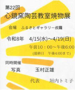 令和8年4月15日(水)~4月19日(日) 第22回 心鏡窯陶芸教室焼物展